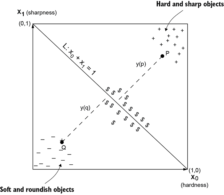 Let’s continue with our example cat brain model to illustrate the idea. As stated earlier, our feature space is 2D, with two coordinate axes X0 signifying hardness and X1 signifying sharpness.3 Individual points in this 2D space are denoted by coordinate values (x0, x1) in lowercase (see figure 1.2). As shown in the diagram, a good way to model the threat score is to measure the distance from line x0 + x1 = 1.