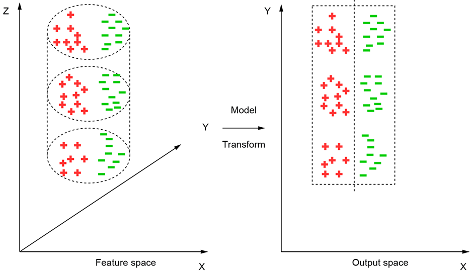 Geometrically speaking, a machine learning model essentially maps a point in the feature space to a point in the output space. It is expected that the classification or estimation job to be performed by the model is easier in the output space than in the feature space. In particular, for a classification job, input points belonging to separate classes are expected to map to separate clusters in output space.