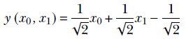 From coordinate geometry, in a 2D space with coordinate axes X0 and X1, the signed distance of a point (a, b) from the line x0 + x1 = 1 is y = (a+b–1)/√2. Examining the sign of y, we can determine which side of the separator line the input point belongs to. In the simple situation depicted in figure 1.2, observation tells us that the threat score can be proxied by the signed distance, y, from the diagonal line x0 + x1 – 1 = 0. We can make the run/ignore/approach decision by thresholding y. Values close to zero imply ignore, positive values imply run away, and negative values imply approach and purr. From high school geometry, the distance of an arbitrary input point (x0=a, x1=b) from line x0 + x1 – 1 = 0 is (a+b–1)/√2. Thus, the function y(x0, x1) = (x0 + x1–1)/√2 is a possible model for the cat brain threat estimator function. Training should converge to w0 = 1/√2, w1 = 1/√2 and b = –1/√2.