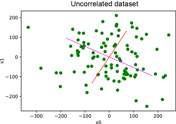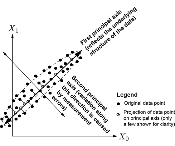 • In many real-life cases, larger variances correspond to the true underlying pattern of the data, while smaller variances correspond to noise (such as measurement error). Projecting the data on the principal axes corresponding to the larger eigenvalues yields lower-dimensional data that is relatively noise-free. The projected data points also match the true underlying pattern more closely, yielding better insights. This is known as dimensionality reduction.
