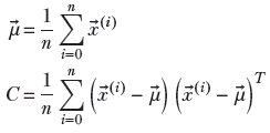 Note how the mean has become a vector (it was a scalar for 1D data) and the scalar variance of 1D, σ, has become a matrix C. This matrix is called the covariance matrix. The (n+1)-dimensional mean and covariance matrix can also be defined a