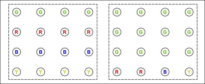 Figure 6.1 Two 4 × 4 images with different pixel color distributions. In the left image, the four colors R, G, B, and Y are equally probable. In the right image, one color (green) is much likelier than the others. The left image has higher entropy (uncertainty): we cannot predict any color with much certainty. In the right image, we can predict green with relative certainty.