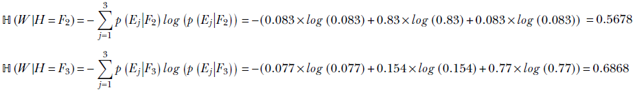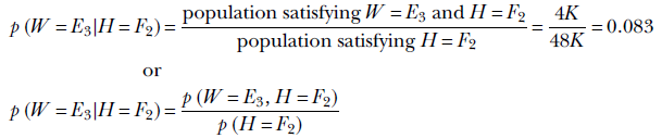 Suppose we know that the height of a subject is between 160 and 183 cm (H = F2). What is the probability of the subject’s weight being more than 90 kg (W = E3)? In statistical parlance, this probability is denoted p(W = E3|H = F2). It is read “probability of W = E3 given H = F2,” aka “probability of W = E3 subject to the condition H = F2.”