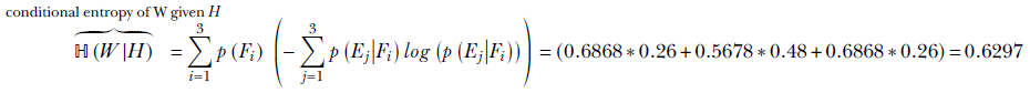 Table 6.2 Example population sizes and joint, marginal, and conditional probabilities for variables W = {E1, E2, E3} and H = {F1, F2, F3} weights and heights of adult Statsville residents). (This is table 6.1 with conditional probabilities added.)