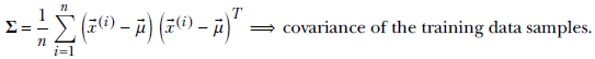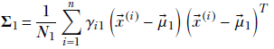 Equation 6.38 assigns to Σ1 the covariance of the training data points. Each data point’s contribution is weighted by the posterior probability, as per the current parameter values, of that data point belonging to class 1.