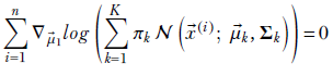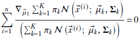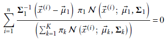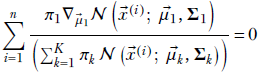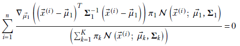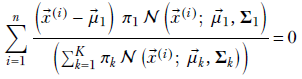 Proceeding similarly, we can derive the corresponding expressions for π1 and Σ1. Let’s collect all the equations for updating the GMM parameters: