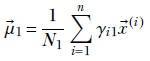 Equation 6.37 assigns to μ1 the centroid of all the training data points. Each data point’s contribution is weighted by the posterior probability, as per the current parameter values, of that data point belonging to class 1.