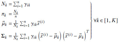 k and Σk for all k using γi, k = p(Z = k|X) from the E-step via equations 6.36, 6.37, and 6.38