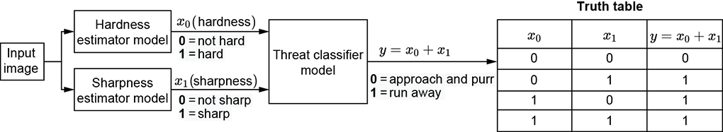 Logical AND—We also exemplify this in terms of the cat brain. Imagine a slightly less timid cat that runs away from things that are both hard and sharp. But it is not scared by hardness and sharpness alone. Its brain can be modeled by the system of machines shown in figure 7.1b.