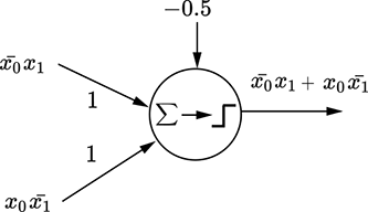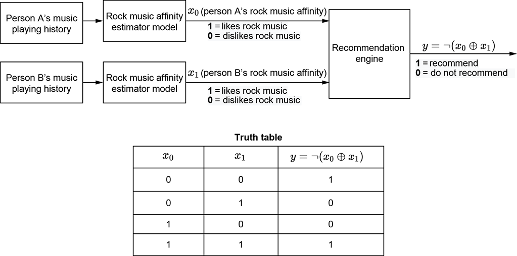Logical XOR—Suppose we are building a social media site. Assume we have a separate detector that, for any person, emits 1 if they like rock music and 0 otherwise. Using this information about two people, the problem is to decide whether they should be recommended as friends to each other. Friendship potential is high if they both like rock music or both dislike it. But if one person likes rock and the other dislikes it, they will probably not be good friends. Thus condition 1 is high rock-music affinity for person 1, and condition 2 is high rock-music affinity for person 2. The exclusive OR of the two conditions is 1 when one is true but the other is not. This machine outputs 1 if the NOT of the exclusive OR is true, meaning neither person likes rock music or both people like rock music. Figure 7.4 depicts this.