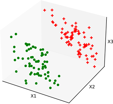 Figure 7.5a shows a 3D space of input vectors along with a set of training data points. The task is to classify them into two classes. In this simple situation, the training points can be partitioned with a hyperplanar decision boundary. Figures 7.5b and 7.5c show some planes that partition the training data poorly, and figure 7.5d shows an optimal planar separator. The only differences between these planes are the values of