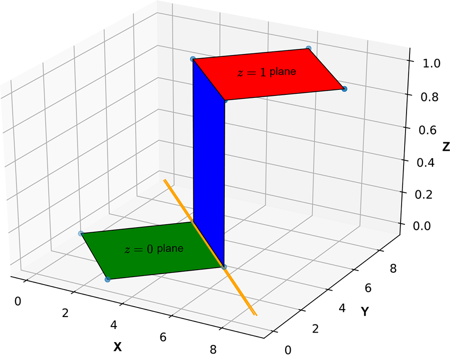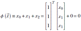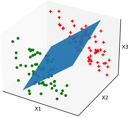 In 3D, we have surfaces like planes and spheres. In more than three dimensions, we have hyperplanes, hyperspheres, and so on. For instance, the plane in figure 7.6 corresponds to
