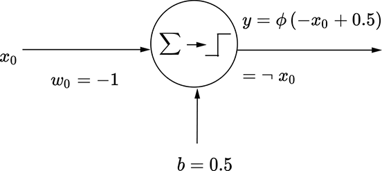 Logical NOT—Consider a machine that sounds an alarm if it sees any unauthorized person in a restricted access area. Let’s assume that we also have a separate machine: a face detector that can recognize the faces of all authorized personnel. It emits a binary decision 1 (recognized face) or 0 (unrecognized face). The overall system takes the output of the face detector and performs a logical NOT operationon it.
