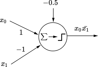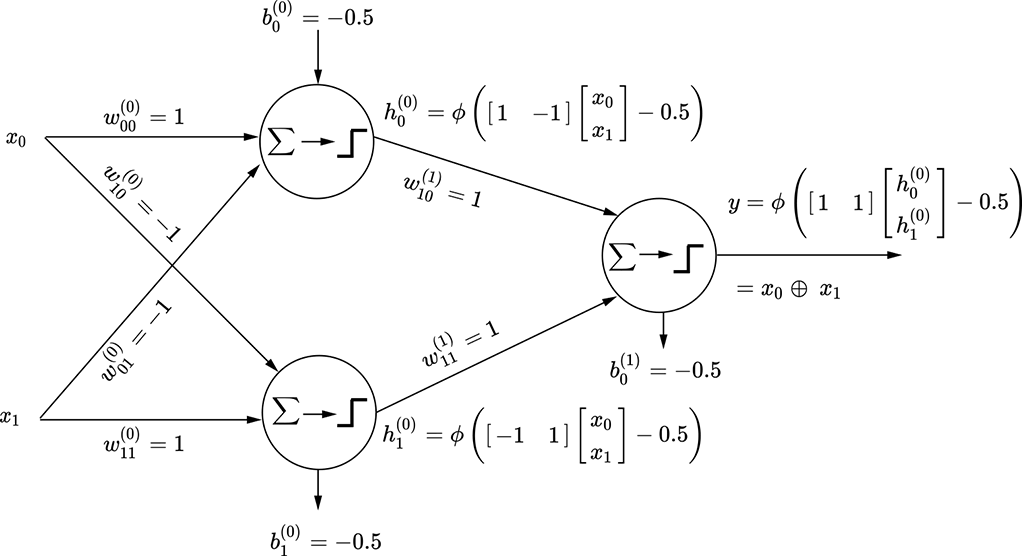 Let’s start with a simple two-variable logical functions y = x̄0x1 + x0x̄1. Table 7.1 shows the corresponding truth table. To create the equivalent MLP, we must pick the rows corresponding to y = 1. Each row can be expressed as an AND of the input variables or their complements. For instance, the row x0 = 0 and x1 = 1, y = 1 corresponds to x̄0x1—the first term of the function we are trying to implement—and can be implemented by the perceptron shown in figure 7.13a. The row x0 = 1 and x1 = 0, y = 1 corresponds to x0x̄1—the second term of the function we are trying to implement—and can be implemented by the perceptron shown in figure 7.13b. We have implemented the individual terms of the function; all that remains is to OR them together into a final MLP, as shown in figure 7.13c. This logical function is our old friend, logical XOR, and the overall function in figure 7.13 is the same as figure 7.12. In this fashion, arbitrary logical expressions in any number of variables can be modeled using MLPs.