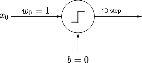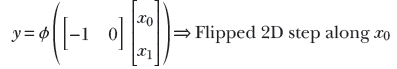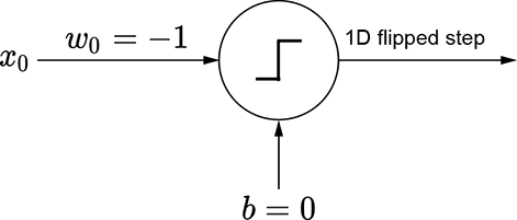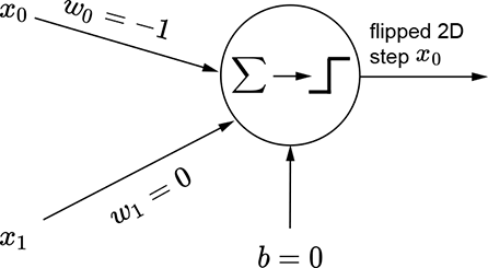 The same idea also works for higher-dimensional inputs. We can generate a step in two variables (a 2D step) aligned to the x0 direction using equation 7.4. This equation’s graph is shown in figure 7.16a, and the perceptron implementing the equation is shown in figure 7.16b. The flipped version of the same step can be generated via equation 7.5. This equation’s graph is shown in figure 7.16d, and the perceptron implementation is shown in figure 7.16e.
