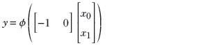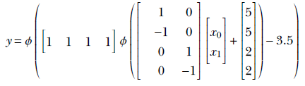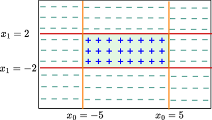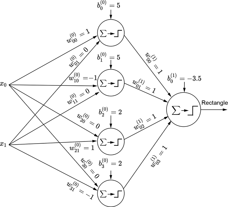 The shaded region corresponding to the class of interest is the region where x0 ≥ − 5 AND x0 ≤ 5 AND x1 ≥ − 2 AND x1 ≤ 2. Now consider the perceptron ϕ(x0+5). It fires (outputs 1) on the region x0 ≥ − 5. Similarly, the perceptrons ϕ(−x0+5), ϕ(x1+2), and ϕ(−x1+2) fire on the regions x0 ≤ 5, x1 ≥ − 2, and x1 ≤ 2, respectively. Hence, by logically ANDing the outputs of these perceptrons, we get an MLP that fires only on the shaded region of interest. Figure 7.53 shows this MLP. It implements the following function: