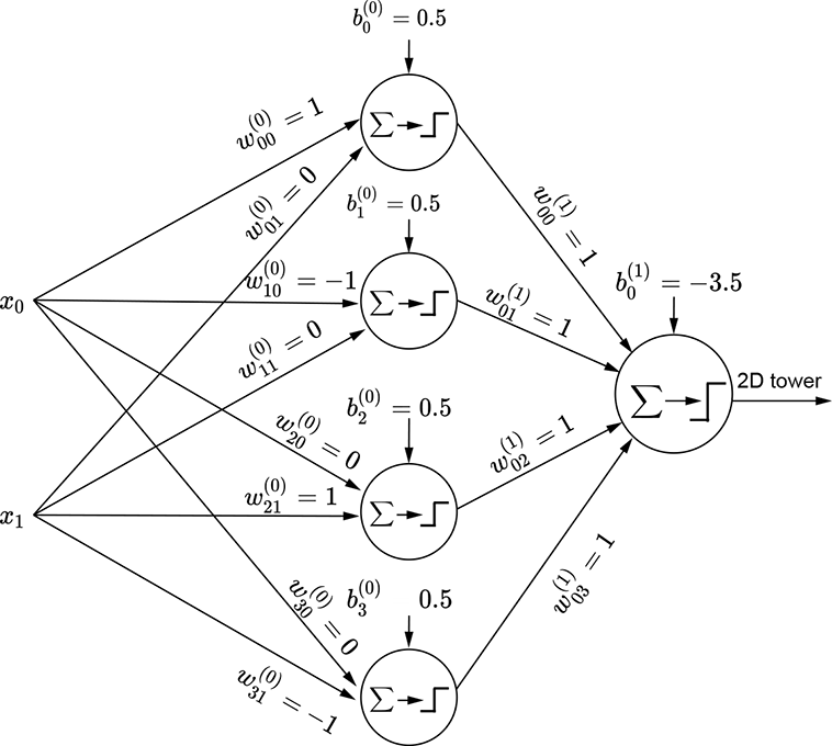 To create a tower, we have to AND a pair of waves along the two separate dimensions. The final tower function is shown in equation 7.8; the corresponding tower graph is shown in figure 7.17a; the MLP is shown in figure 7.17b. Any continuous 2D surface can be approximated to arbitrary levels of accuracy by combining such 2D towers: