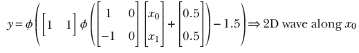 In the 1D case, we combine a regular step with its flipped and shifted version to generate a tower. The process is slightly more complicated in 2D. Here, combining a step along a specific coordinate axis with its flipped and shifted version generates a wave function along that axis. Thus, we have separate waves in each dimension. The wave along the x0 axis corresponds to equation 7.6; its graph is shown in figure 7.16g. It is implemented by the MLP in figure 7.16h. Similarly, a 2D wave along the x1 axis can be generated via equation 7.7 and is graphed in figure 7.16j. The corresponding MLP is shown in figure 7.16k.