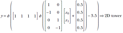 The basic idea is depicted in figure 7.15. We can obviously generate a regular step with a perceptron implementing y = ϕ(x). The corresponding graph is shown in figure 7.15a. By imparting a bias of 5, we can shift this step leftwards. The corresponding function is y = ϕ(x+5). Furthermore, using negative weight laterally flips the step. The corresponding function is y = ϕ(−x), whose graph is shown in figure 7.15c. By imparting a bias of 5, we can shift the flipped step rightwards. Figure 7.15e shows a flipped and right-shifted step corresponding to the function y = ϕ(−x+5), whose perceptron is shown in figure 7.15f. Logically ANDing a left-shifted step with a flipped and right-shifted step yields a tower in 1D. This corresponds to the function y = ϕ(ϕ(x+5)+ϕ(−x+5)−1.5), whose graph is shown in figure 7.15g.