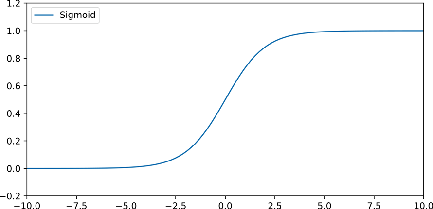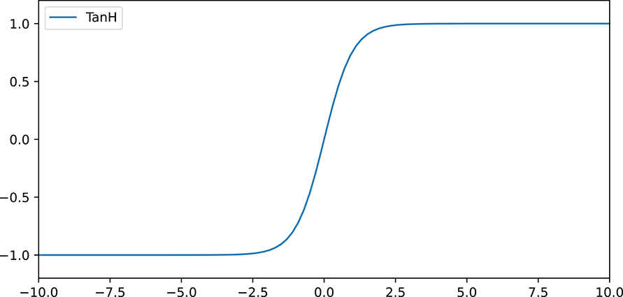 An alternative to the sigmoid function is the hyperbolic tangent tanh function, shown in figure 8.4. It is very similar to the sigmoid function, but the range of output values is from [−1,1] as opposed to [0,1]. In essence, it is the sigmoid function stretched and shifted so it is centered around 0. The equation of the tanh function is given by