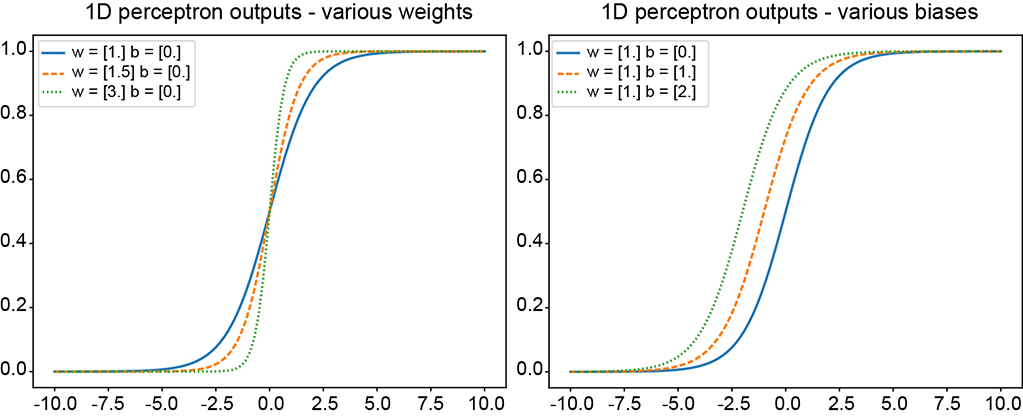 Figure 8.2 shows how the parametrized sigmoid curve changes with different values for the parameters w and b. In particular, note that for large values of w, the parameterized sigmoid is virtually indistinguishable from the Heaviside step function (compare the dotted curve in figure 8.2a with figure 7.7), even though it remains differentiable. This is exactly what we desire in neural networks.