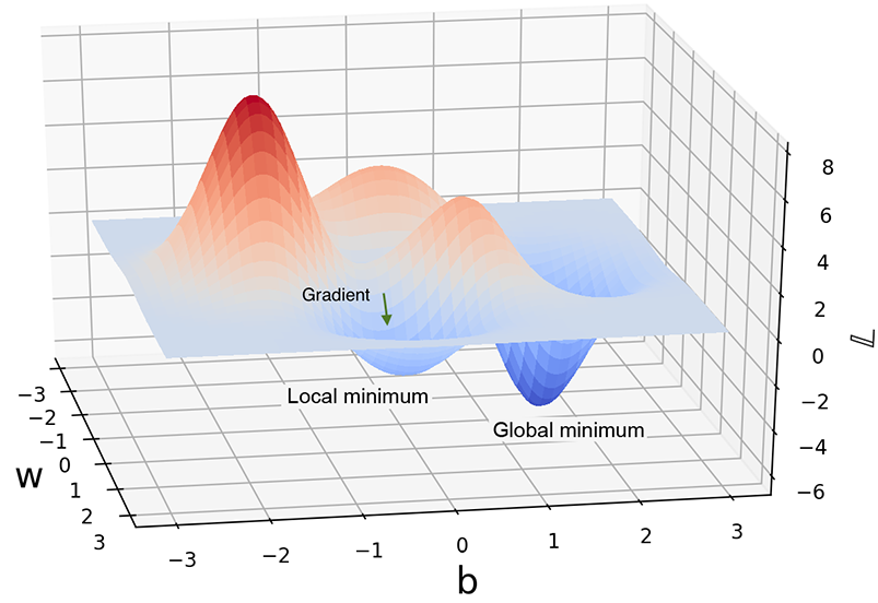 • We minimize the loss by iteratively adjusting the weights and biases. The quickest way to reach the closest minimum of a multivariate function is to follow the gradient. Hence, we adjust the weights and biases following the gradient of the loss function. Mathematically,