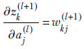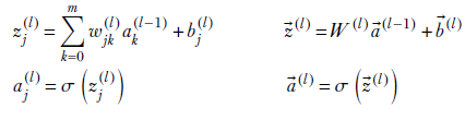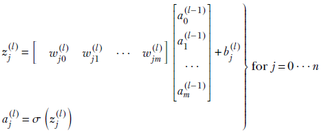 Let a0(l − 1), a1(l − 1), , am(l − 1) denote the outputs of the m neurons in layer (l − 1) (the left-most input column of nodes in figure 8.6). And let a0(l), a1(l), , an(l) denote the outputs of the n neurons in layer l. Note that we typically use the symbol a, standing for activation, to denote the output of individual neurons. Now consider the jth neuron in layer l. For instance, check z1(l) in figure 8.6: note the weights going into it and the activations at their source. Its output is aj(l), where