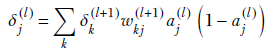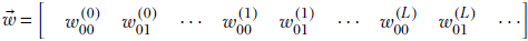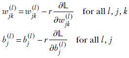 Each weight in the MLP, wjk(l), is adjusted by an amount proportional to δwjk(l). Similarly, each bias bj(l) is adjusted by an amount proportional to δbj(l). We can denote all this compactly by saying we have a weight vector and bias vector . In each iteration, we change by amount δ and by δ so that their new values are and r is a constant known as the learning rate that needs to be set at the beginning of training). In this context, it is worthwhile to note that in section 8.3.1, we expressed the collection of weights in an MLP with a matrix, while here we are referring to the same thing as a vector. These are not incompatible because we can always rasterize the elements of a matrix (that is, walk over the elements of the matrix from top to bottom and from left to right) into a vector.