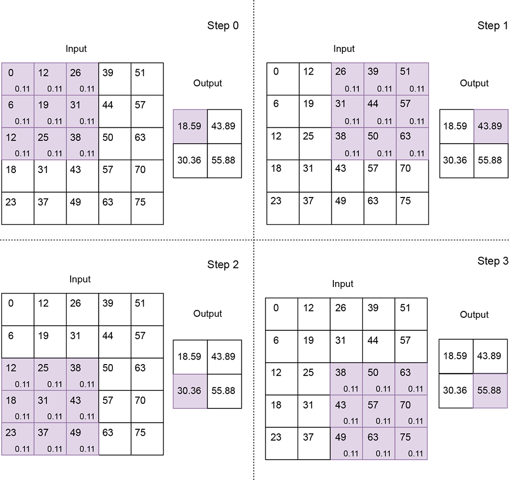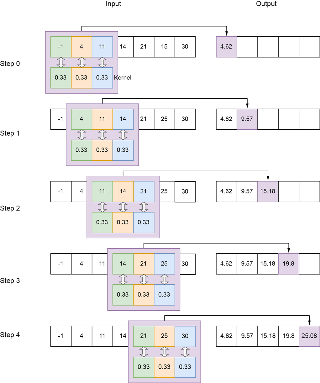In this section, we look at how to perform local averaging via convolution, from a physical and algebraic viewpoint, to get a comprehensive understanding. The 1D kernel with weight vector