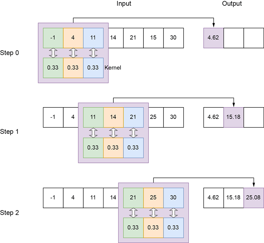 Figure 10.1 1D convolution with a local averaging kernel of size 3, stride 1, and valid padding on the input array of size 7