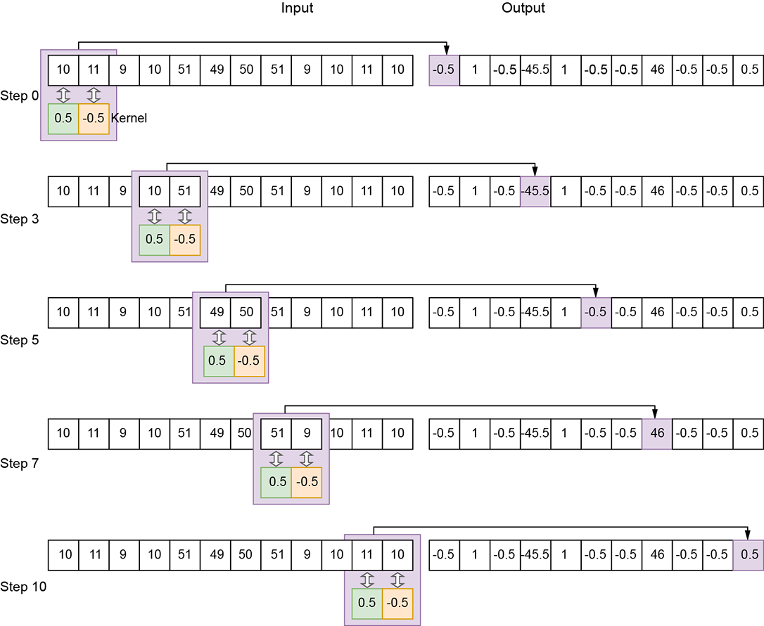 Figure 10.3 1D convolution with an edge-detection kernel of size 2, stride 1, valid padding. Not all slide stops (that is, steps) are shown.