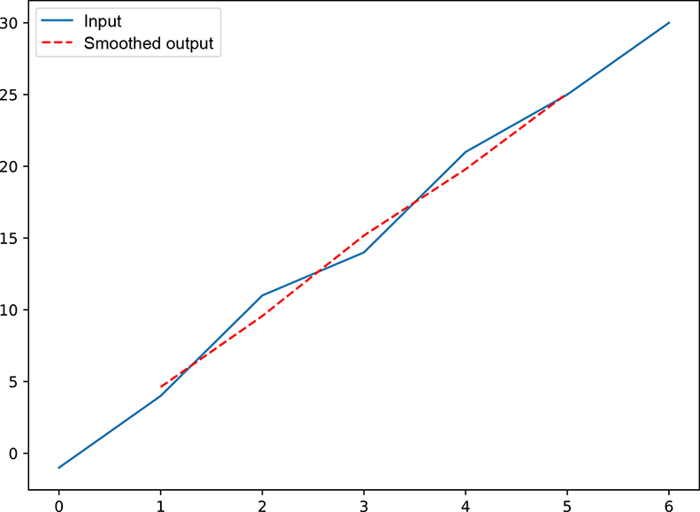 (shown in figure 10.1) essentially takes the moving average of successive sets of three input values. As such, it is a local averaging (aka smoothing) operator. This becomes apparent if we examine the plots of the raw input vector with regard to the input vector convolved with the kernel (figure 10.5). The input (solid line) weaves up and down, while the output is a smooth curve (dashed line) through the mean position of the input. In general, the output produced by convolving by a kernel with all equal weights (the weights must be normalized, meaning the sum of the weights is 1) is a smoothed (locally averaged) version of the input. Why do we want to smooth an input vector? Because it captures the broad trend in the input data while eliminating short-term fluctuations (often caused by noise). If you are familiar with Fourier transforms and frequency domains, you can see that this is essentially a low-pass filter, eliminating short-term, high-frequency noise and capturing the longer-term, low-frequency variation in the input data array.