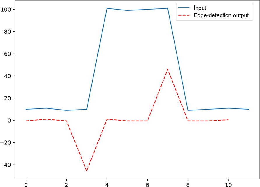 An edge is defined as a sharp change in the values in an input array. For instance, if two successive elements in the input array have a large absolute difference in values, that is an edge. If we graph the input array (that is, plot the input array values in the y axis against the array indices), an edge will appear in the graph. For instance, consider the input array in figure 10.3 (graphed in figure 10.6). At indices 0 to 3, we have values in the neighborhood of 10. At index 4, the value jumps to 51. We say there is an edge between indices 3 and 4. The values then remain in the neighborhood of 50 at indices 4 to 7. Then they jump back to the neighborhood of 10 in the remaining indices. We say there is another edge between indices 7 and 8. The convolution we examine here will emit a high response (output value) exactly at the indices of the jump—3 and 7—while emitting a low response at other indices. This is an edge-detection convolution (filter). Why do we want to detect edges? Because edges are important for understanding images. Locations at which the signal changes rapidly provide more semantic clues than flat uniform regions. Experiments on the human visual cortex have established that humans pay more attention to locations where color or shade changes rapidly than to flat regions.