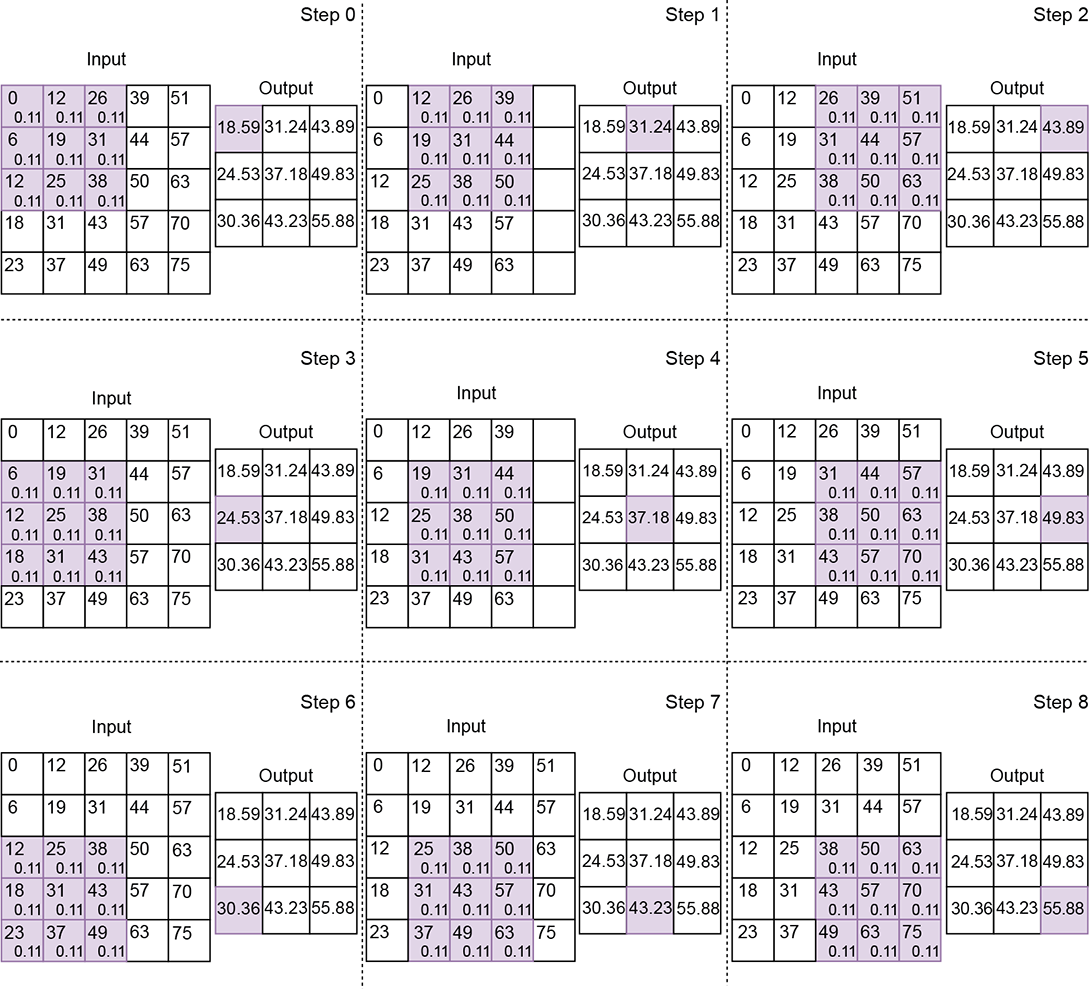 Algebraically, the convolution with a kernel of size 3, stride 1, and valid padding can be shown as follows. Let the input array be