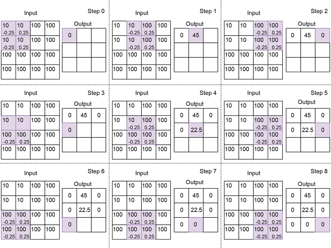 Padding—As the kernel slides toward the extremity of the input array, parts of it may fall outside the input array. In other words, part of the kernel falls over ghost input elements. Figure 10.4 shows such a situation: the ghost input array elements are shown with dashed boxes. There are multiple strategies to deal with this: