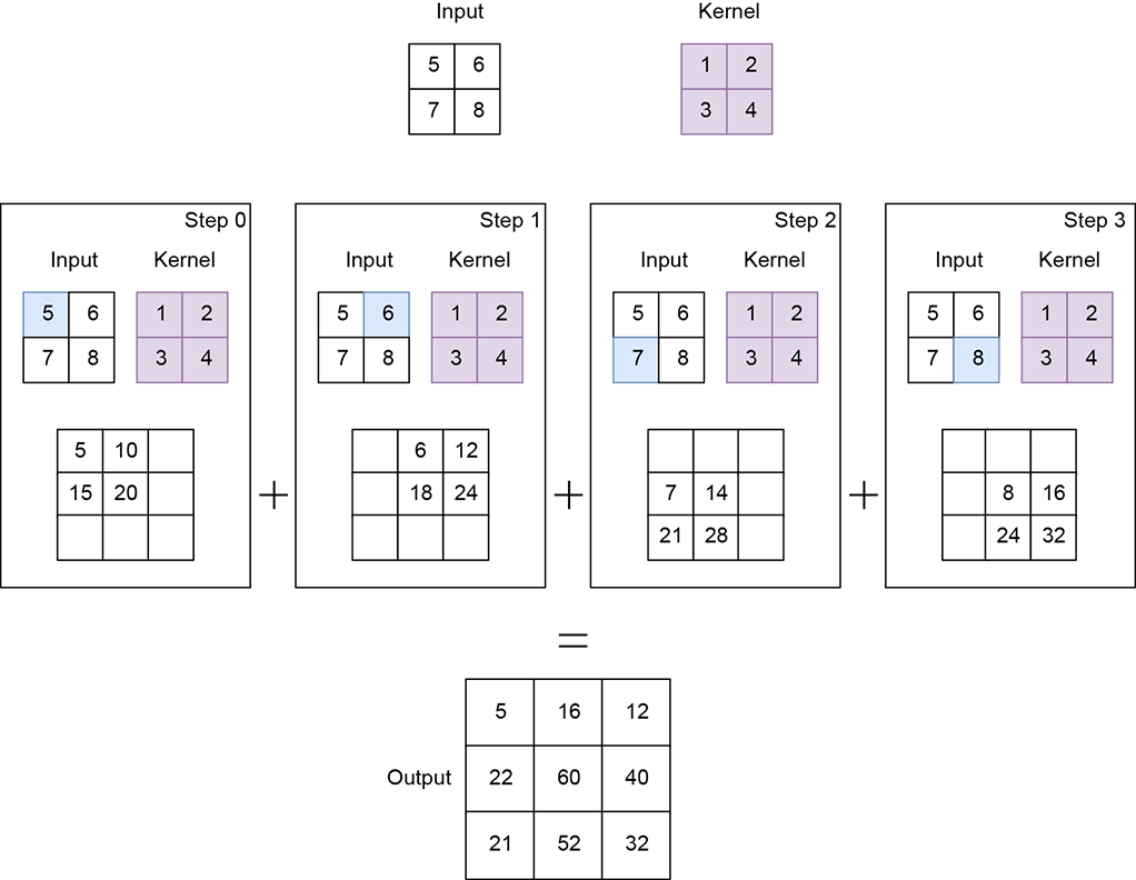 NOTE Fully functional code for transpose convolution, executable via Jupyter Notebook, can be found at http://mng.bz/radD.