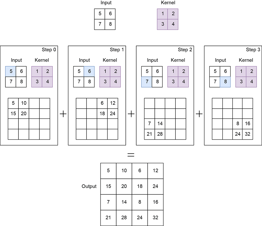 Figure 10.18 shows an example with input of shape 1 × 1 × 2 × 2. The kernel is of shape 1 × 1 × 2 × 2. Transpose convolution with stride 2 results in an output of shape 1 × 1 × 4 × 4.