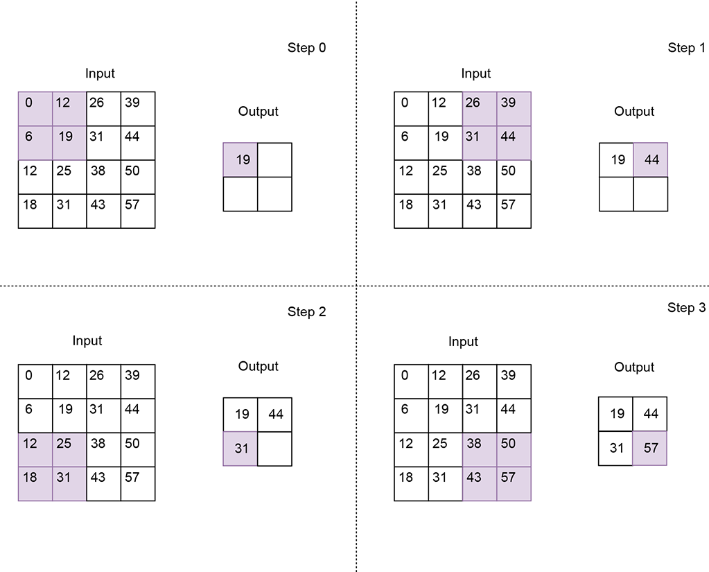 Figure 10.19 Max pooling using a 2 × 2 kernel with stride 2. The resulting output feature map is half the size of the input feature map. Each value of the output feature map is a max of the corresponding local patch in the input feature map.