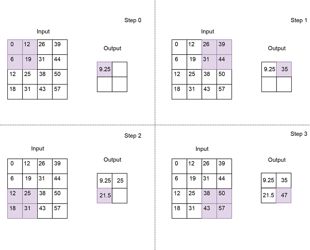 Figure 10.20 Average pooling using a 2 × 2 kernel with stride 2. The resulting output feature map is corresponding local patch in the input feature map.