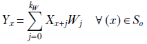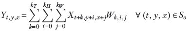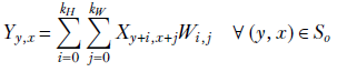 Equation 10.1 shows how a single output value is generated in 1D convolution. X denotes input, Y denotes output, and W denote kernel weights:
