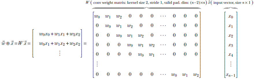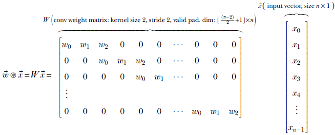 Equation 10.2 expresses kernel_size 3, stride 1, valid padding convolution as a multiplication of a weight matrix W with input vector
