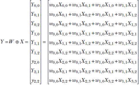 Equation 10.2 depicts a stride of 1. For instance, if the stride is 2, the kernel weights will shift by two positions in successive rows. This is shown in equation 10.3: