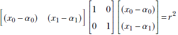 Note that left hand side of this equation is a quadratic form. The original x0, x1-based equation only works for two dimensions. The matrix based equation is dimension agnostic: it represents a hypersphere in an arbitrary-dimensional space. For a two-dimensional space, the two equations become identical.