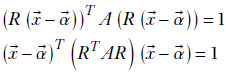 . Once again, the matrix representation is dimension independent. In other words, equation 4.1 represents a hyperellipsoid. Note that if the ellipse axes are aligned with the coordinate axes, matrix A is diagonal. If we rotate the coordinate system, each position vector is rotated by an orthogonal matrix R. Equation 4.1 is transformed as follows (we have used the rules for transposing the products of matrices from equation 2.10):