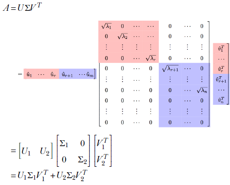 Singular value decomposition (SVD) allows us to decompose an arbitrary m × n matrix A as a product of three matrices: A = UΣVT, where U, V are orthogonal and Σ is diagonal. Matrix V has the eigenvectors of ATA as its columns. U has eigenvectors of AAT as columns. Σ has the eigenvalues of ATA sorted in decreasing order) in its diagonal.