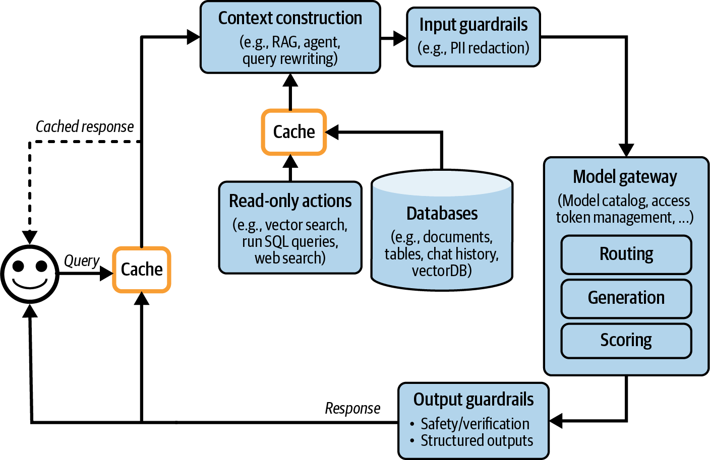 Caching has long been integral to software applications to reduce latency and cost. Many ideas from software caching can be used for AI applications. Inference caching techniques, including KV caching and prompt caching, are discussed in Chapter 9. This section focuses on system caching. Because caching is an old technology with a large amount of existing literature, this book will cover it only in broad strokes. In general, there are two major system caching mechanisms: exact caching and semantic caching.