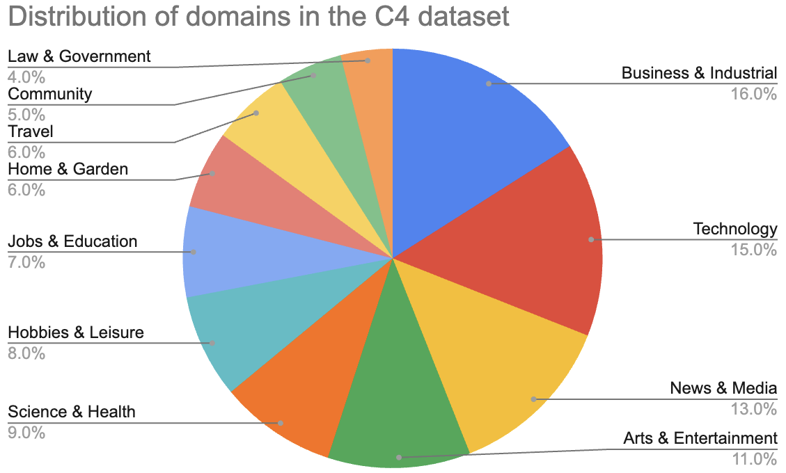 Figure 2-3. Distribution of domains in the C4 dataset. Reproduced from the statistics from the Washington Post. One caveat of this analysis is that it only shows the categories that are included, not the categories missing.