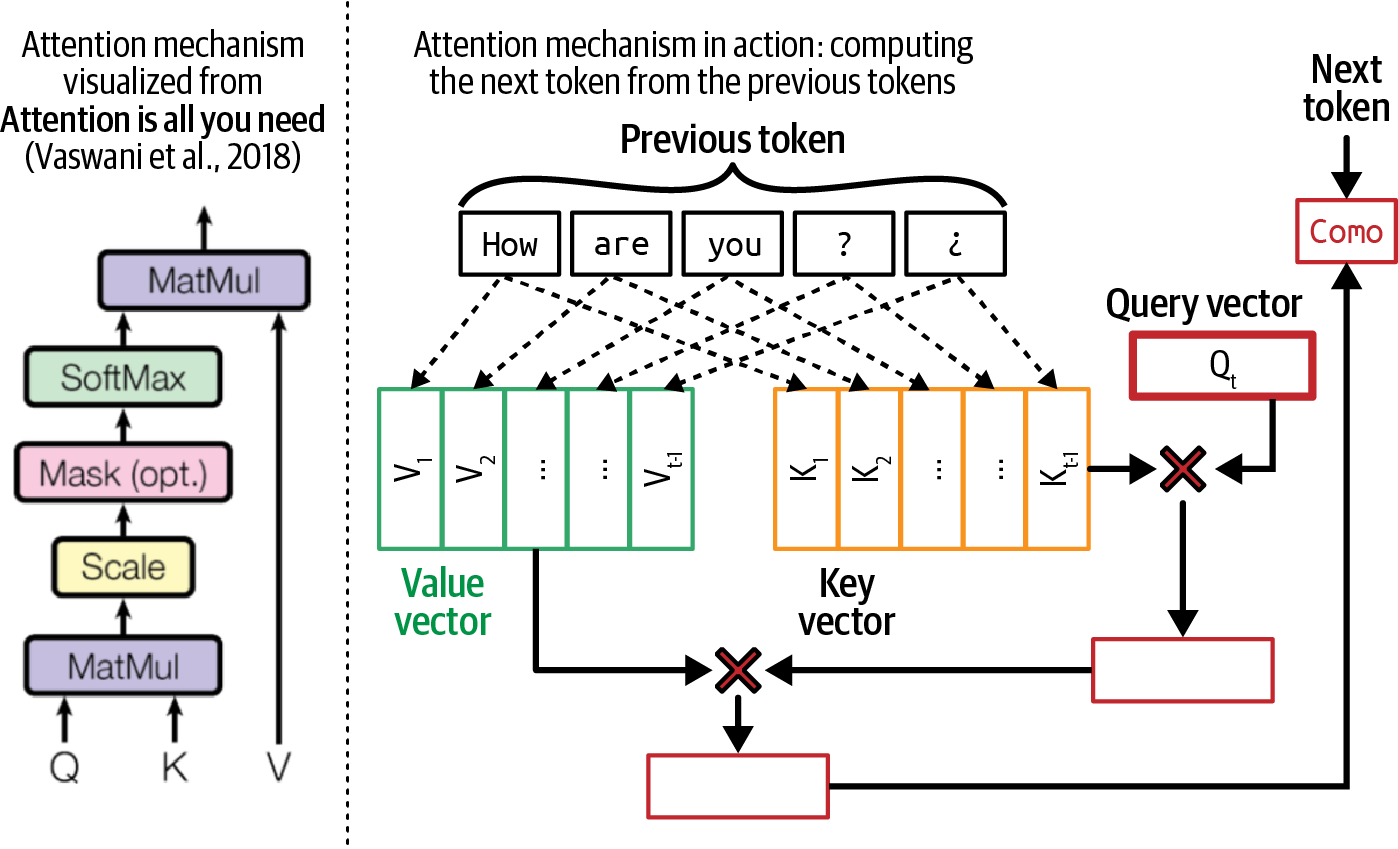 The transformer architecture addresses both problems with the attention mechanism. The attention mechanism allows the model to weigh the importance of different input tokens when generating each output token. This is like generating answers by referencing any page in the book. A simplified visualization of the transformer architecture is shown in the bottom half of Figure 2-4.