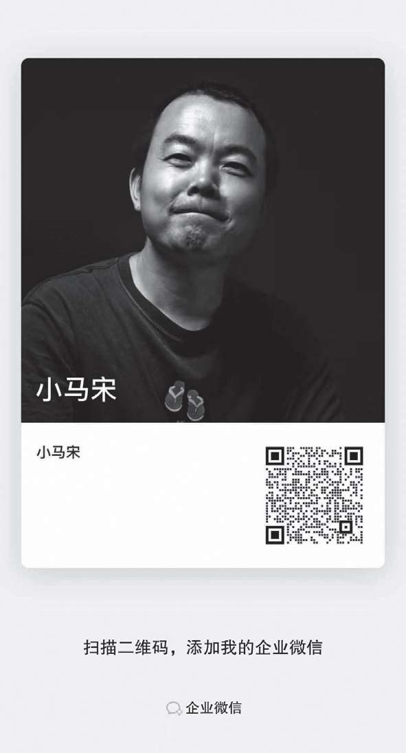 最后,你也可以加我的企业微信号,随时与我交流。因为个人微信号限制的好友人数是一万人,所以只能放一个企业微信号在这里,但这个企业微信号绝对是我,小马宋本人亲自维护的。